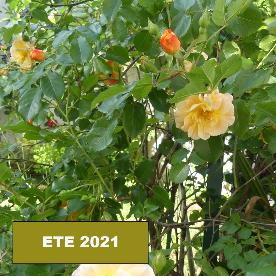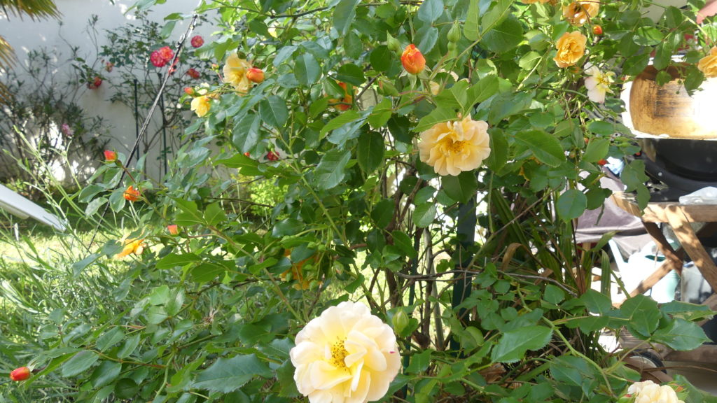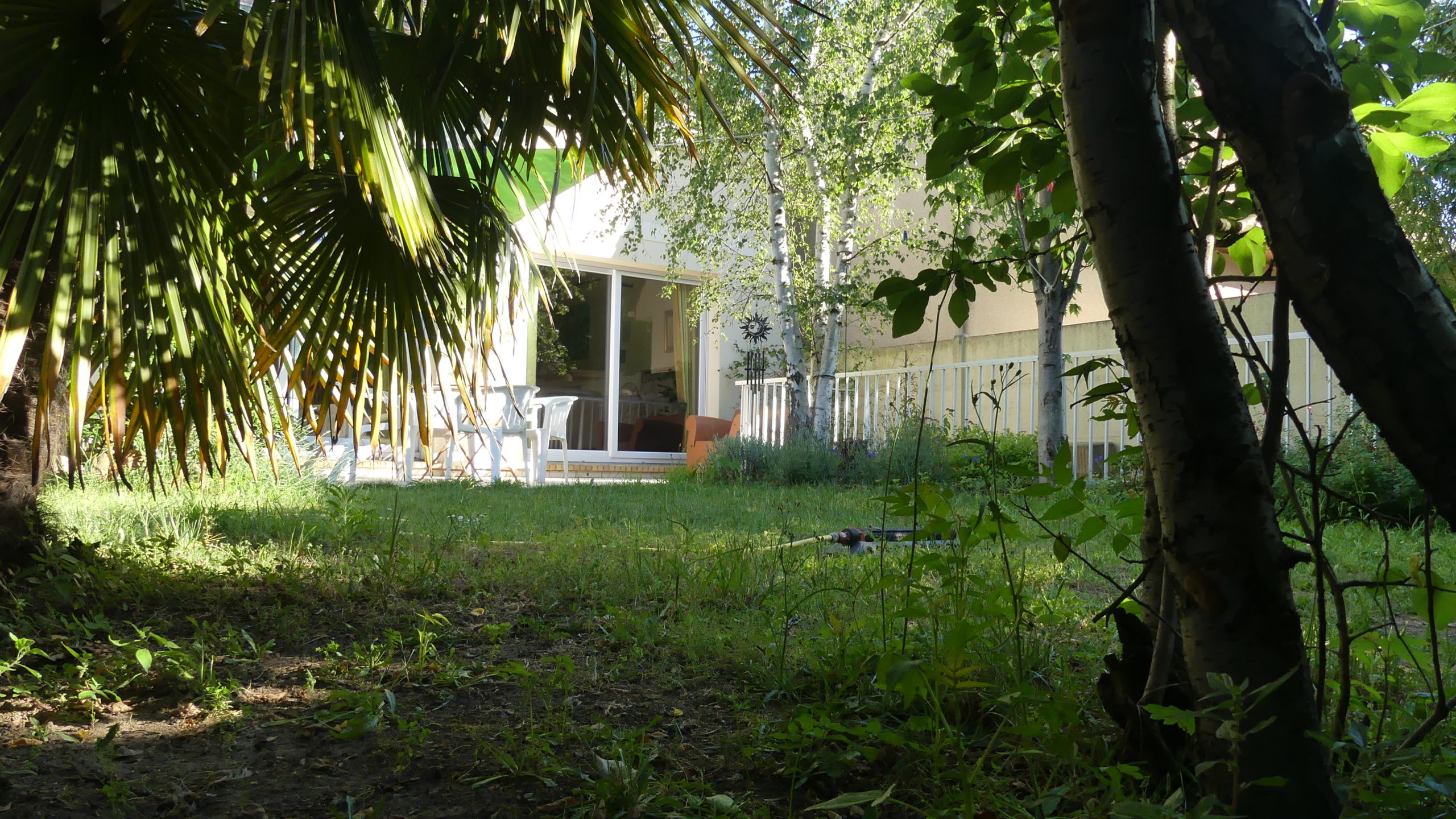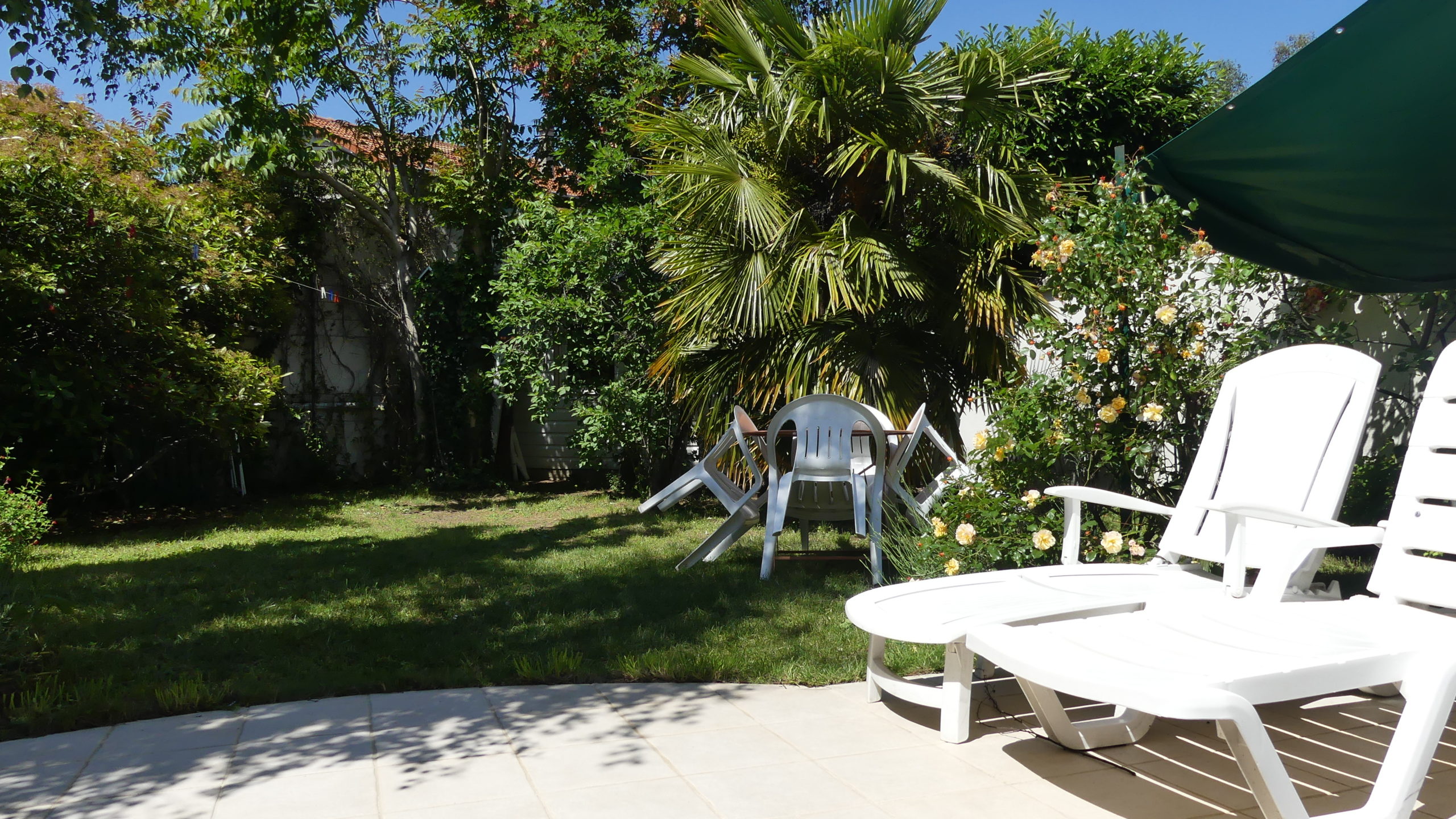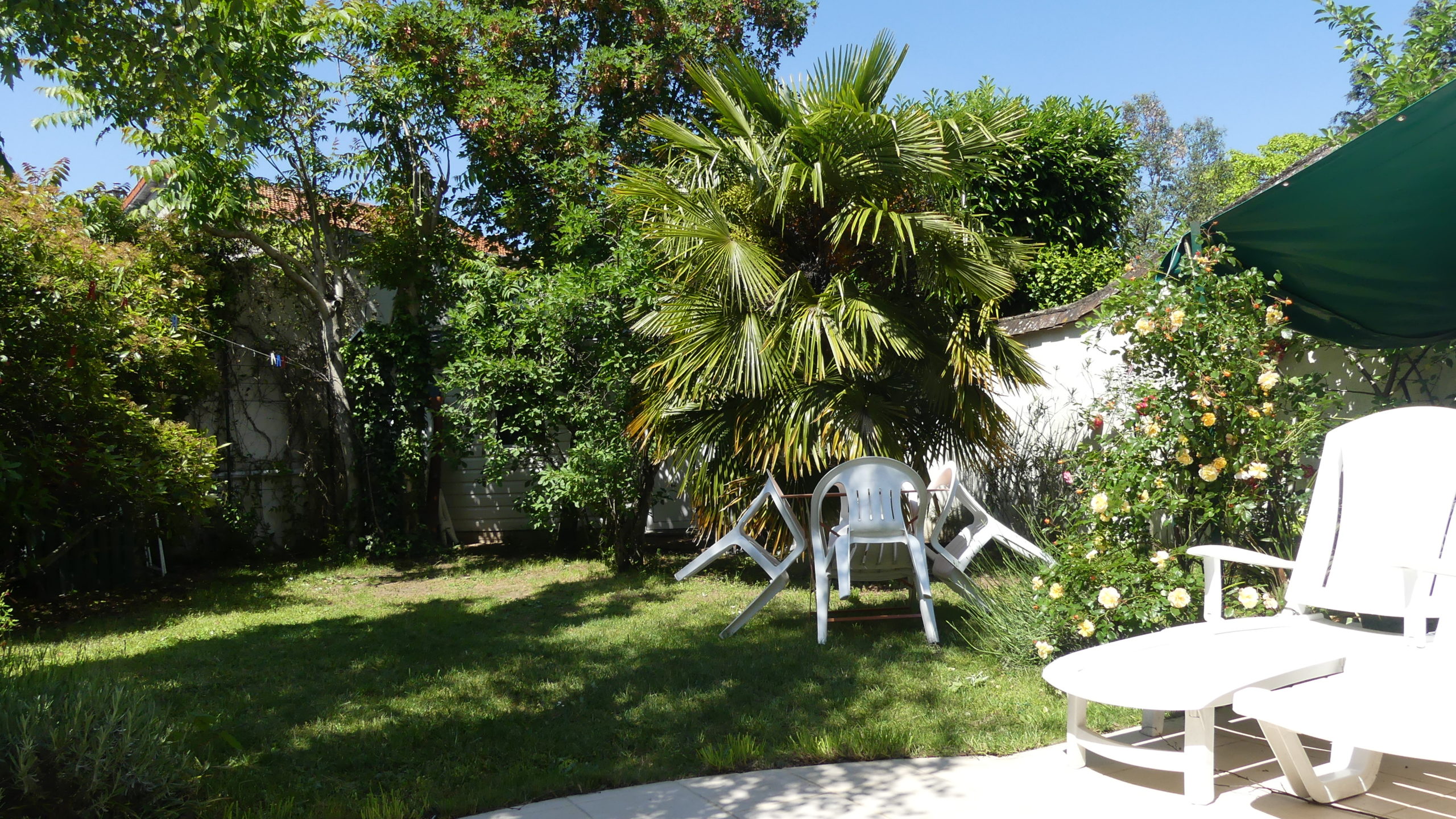 Gazon, roses et palmier